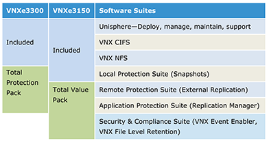 To address needs ranging from disaster recovery to application backup and restore, EMC has packaged unique and powerful add-on storage software into easy-to-use suites to ensure maximum protection and security for your VNXe unified storage platforms. With this approach, VNXe software suites simplify enablement of storage services, while dynamically moving, securing, and protecting production data for unified block and file storage—all managed through, and integrated with, EMC Unisphere. For even greater simplicity, purchase the VNXe3150 Total Value Pack or the VNXe3300 Total Protection Pack.